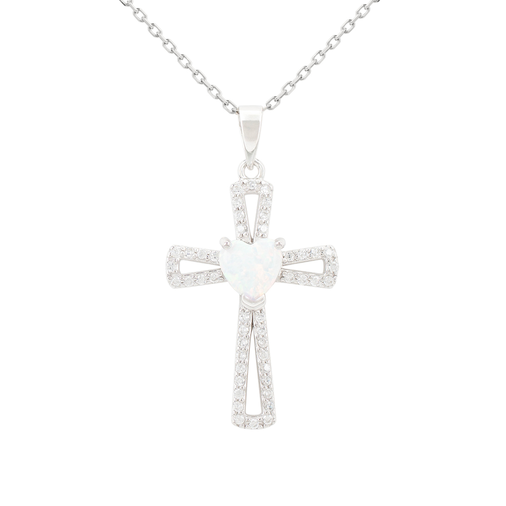 Silver Cross with Clear CZ with White Opal Heart Center Pendant