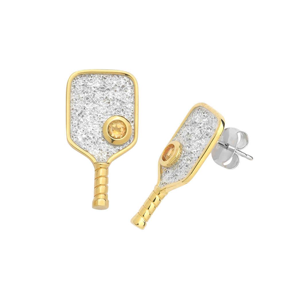 .925 Silver two-tone rhodium and gold-plated textured Pickleball paddle with a citrine gemstone bezel set post earrings