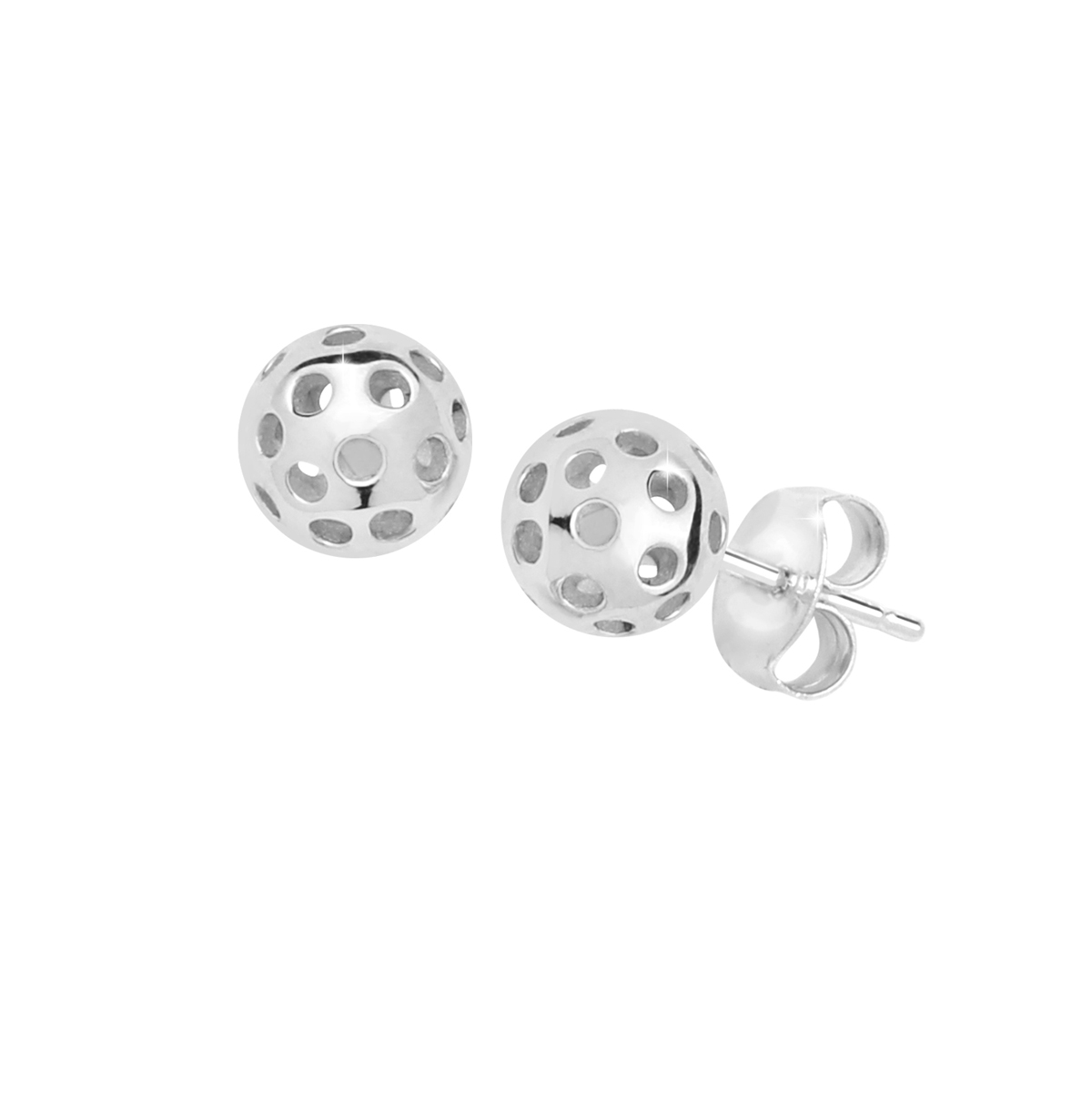 Silver Three-Quarter Pickleball Hoop Post Earrings with Two Balls on Chain Dangling All Rhodium