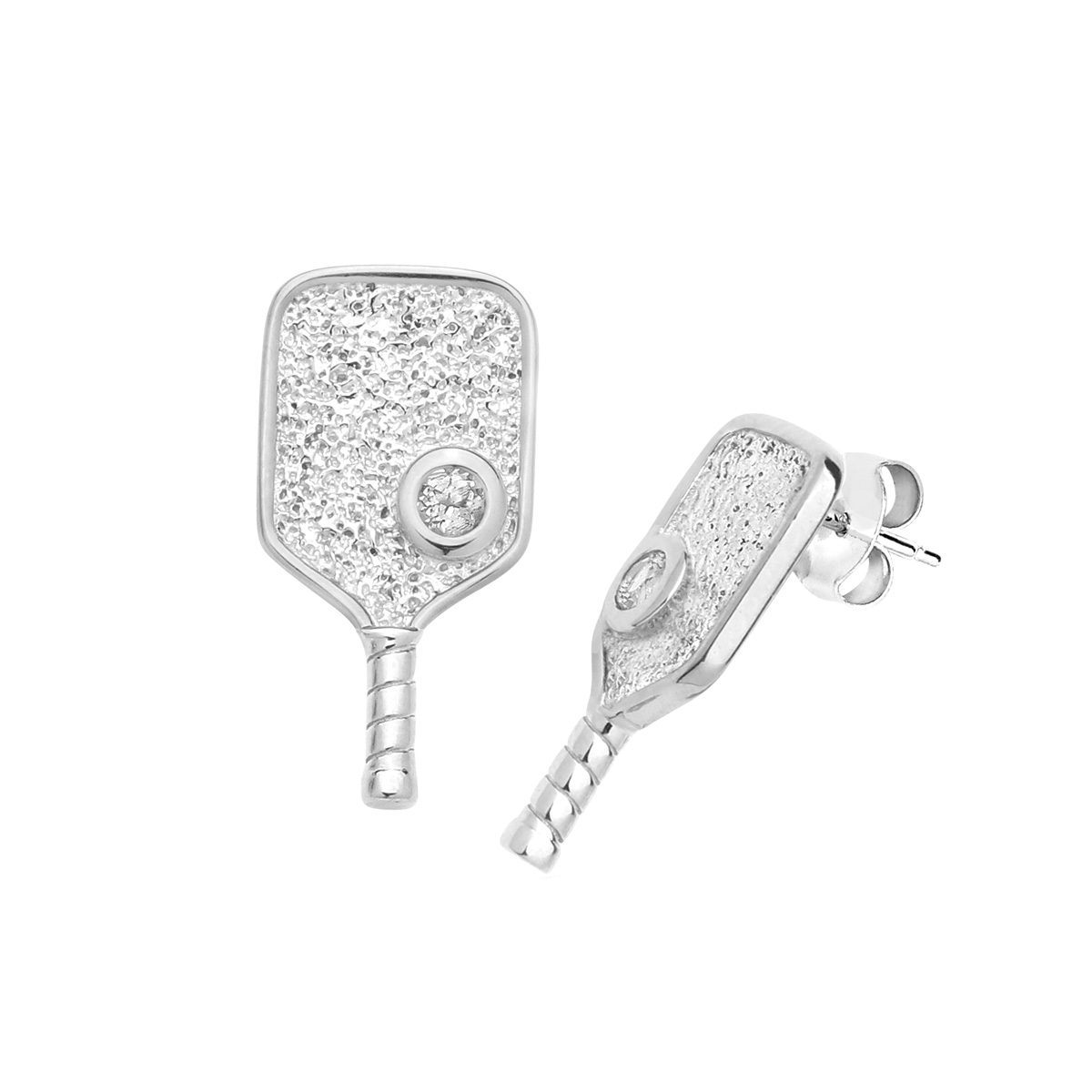 .925 Silver two-tone rhodium and gold-plating textured pickleball paddle with genuine white topaz post earrings
