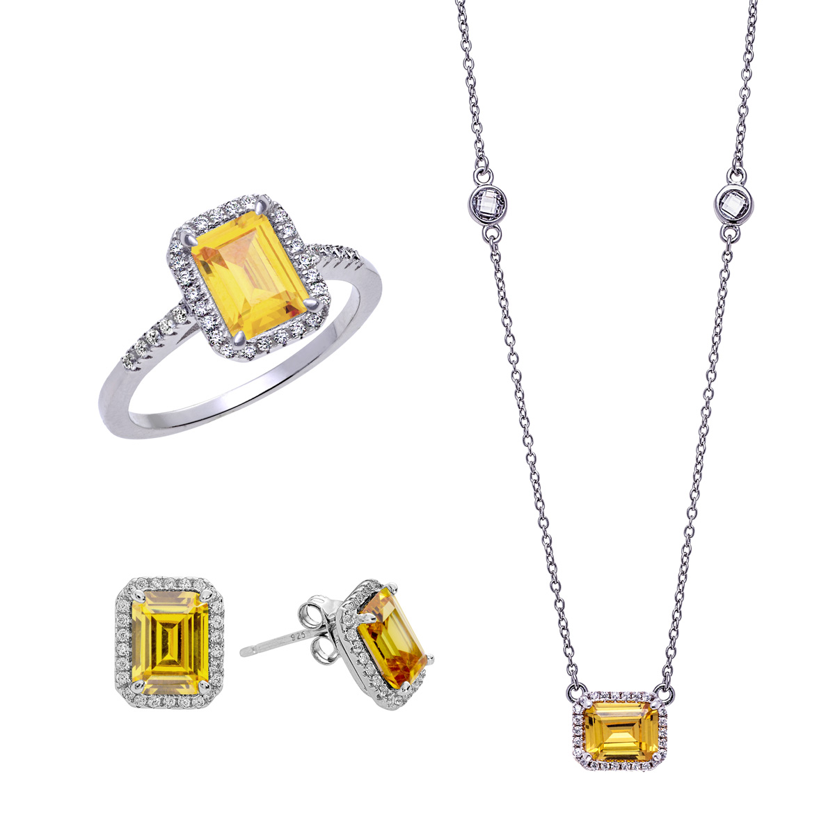 .925 Silver Clear CZ's Halo Design with Large Yellow CZ Center Post Earrings, Ring Size 7 (only) and Necklace 16"+3" Extender November Set