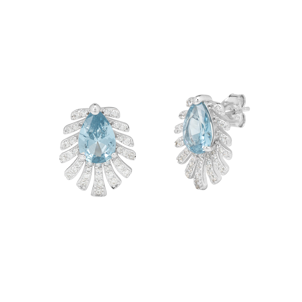 Silver Clear CZ Rays From Center Blue Pear Center CZ Earrings