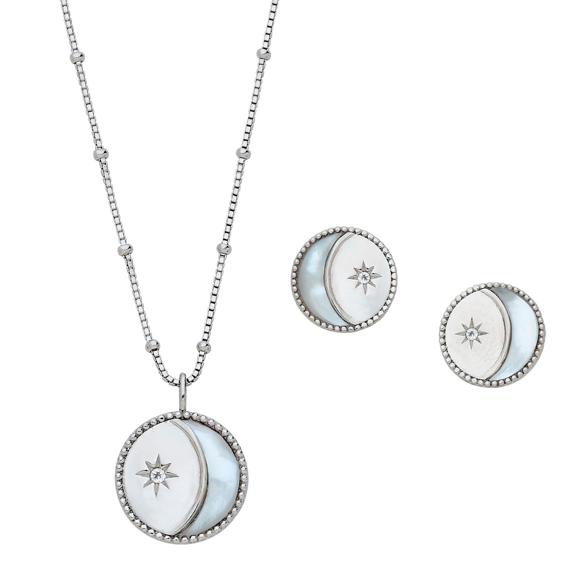 .925 Silver moon and star with Mother of Pearl + genuine White Topaz; Necklace 16"+2" ext. beaded box chain and Earring Set