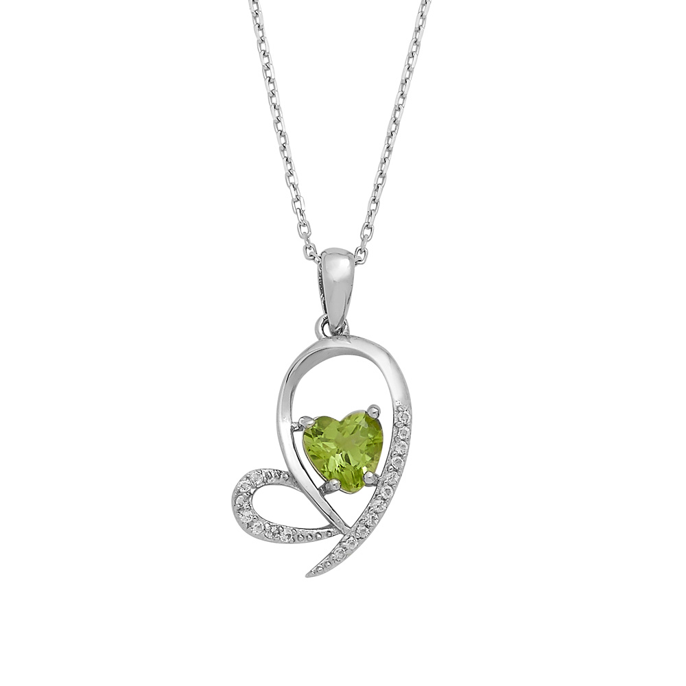 .925 Silver Open Heart Design Pendant with Heart Shape Genuine Peridot and White Topaz side stones