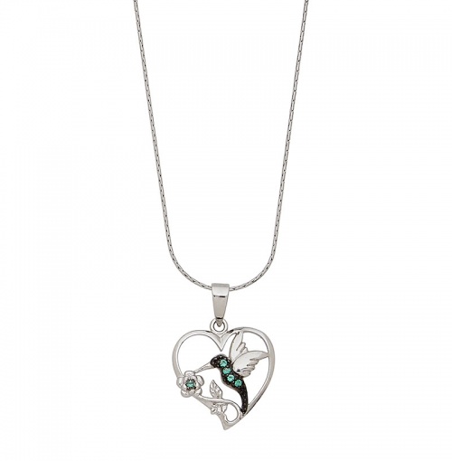 .925 Silver Open Heart with Nano Green Humming Bird and Flower