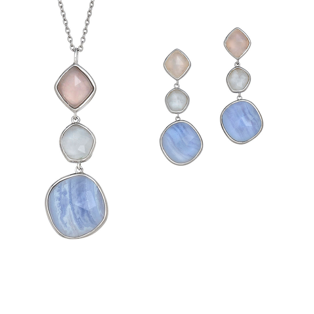 Silver Triple Genuine Stone Earrings with Blue Lace Agate, Moonstone and Rose Quartz