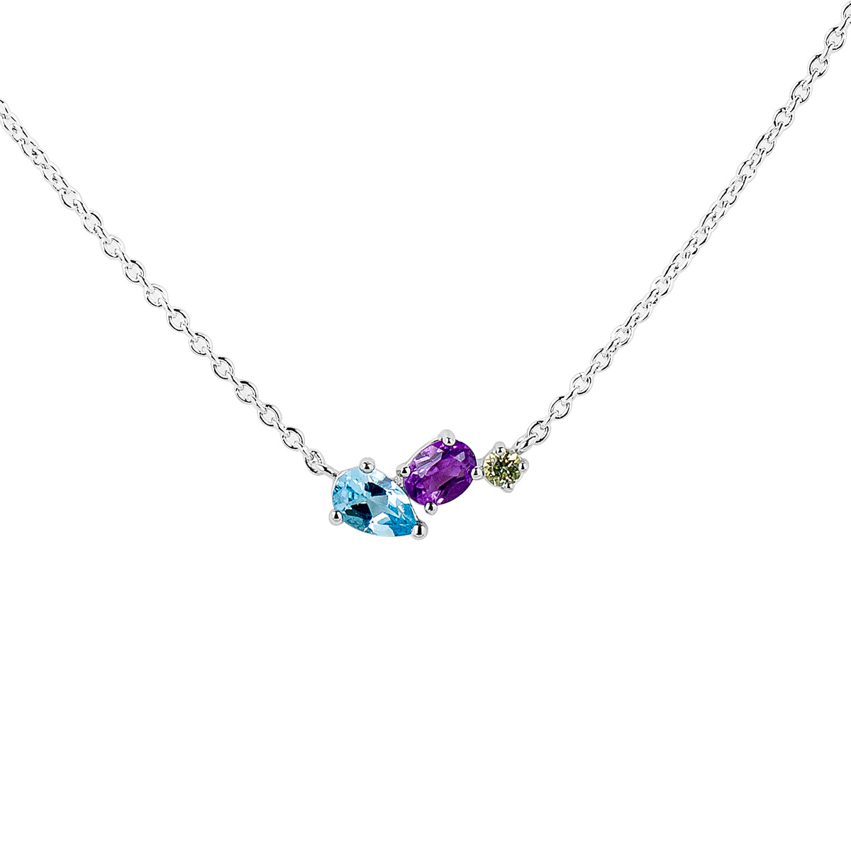 .925 Silver triple genuine stones necklace (10.9mm) 16"+3" ext with swiss blue topaz, african amethyst and peridot