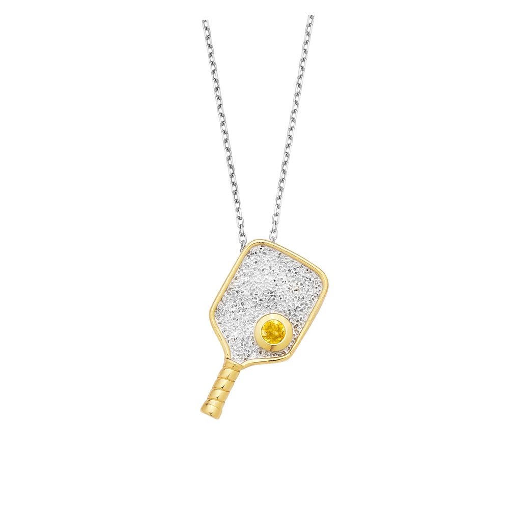 .925 Silver two-tone rhodium and gold-plated textured Pickleball paddle with a citrine gemstone bezel set hidden bail pendant with 18" rolo chain