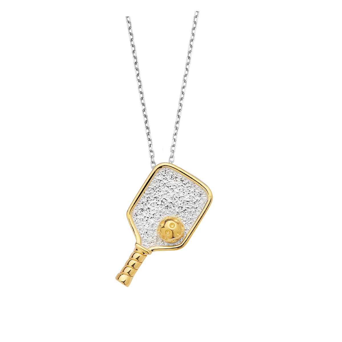 .925 Silver two-tone rhodium and gold-plating Pickleball textured paddle with ball hidden bail pendant